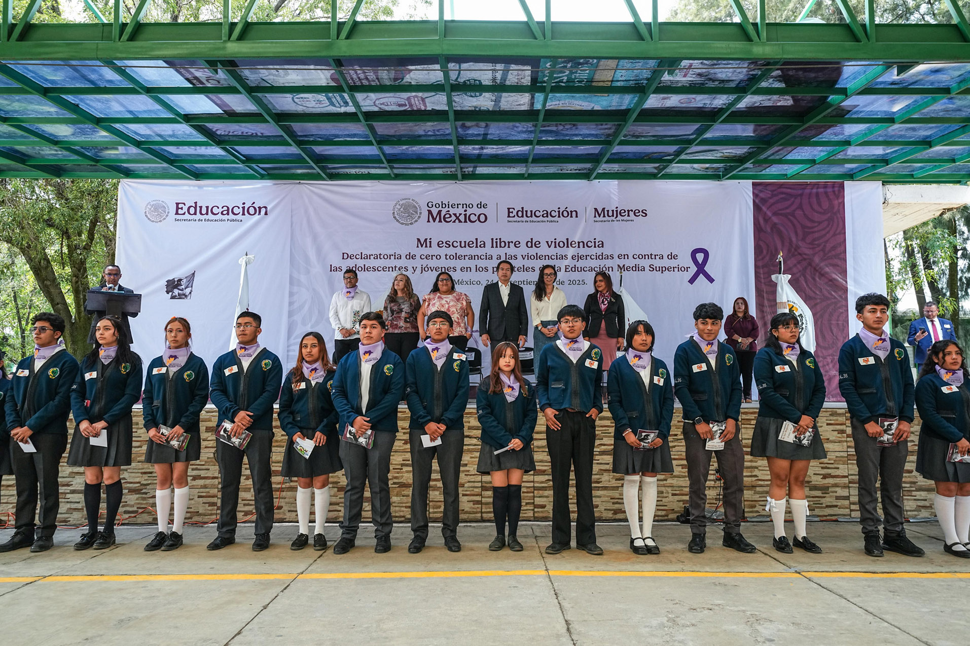 En el Centro de Bachillerato Tecnológico Agropecuario (CBTA) No. 35 “Leona Vicario”, en Valle de Chalco Solidaridad, Estado de México, el secretario de Educación Pública, Mario Delgado Carrillo, y la secretaria de las Mujeres, Citlali Hernández Mora, encabezaron la presentación de la Declaratoria de “Cero Tolerancia” a las violencias ejercidas en contra de adolescentes y jóvenes en los planteles de Educación Media Superior. El documento fue leído por 21 alumnas y alumnos del plantel, quienes, a nombre de toda la comunidad educativa, se comprometieron a cumplirlo.