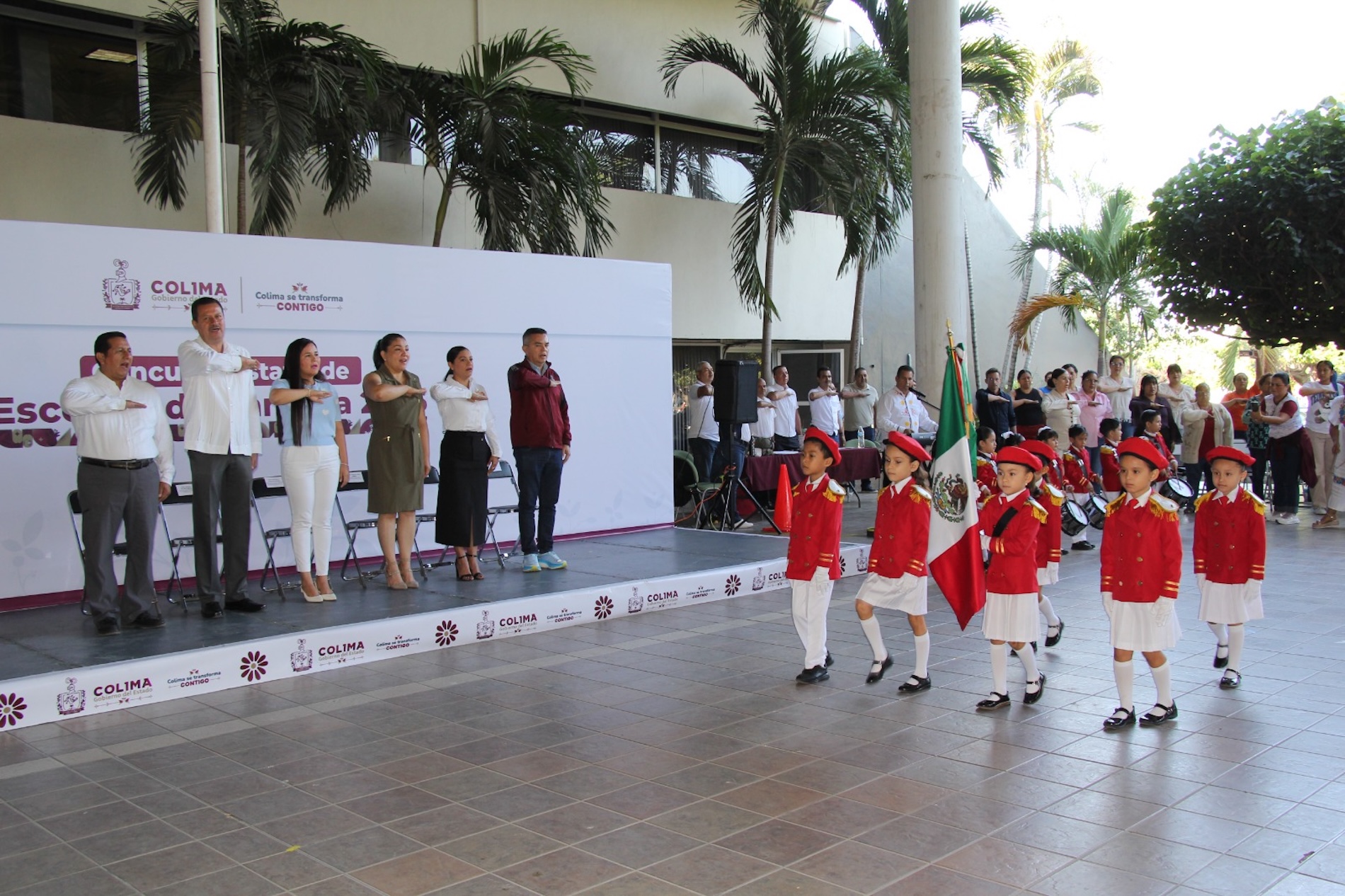 La Secretaría de Educación y Cultura del Gobierno del Estado de Colima realizó este lunes la primera Exhibición Estatal de Escoltas de Bandera de nivel preescolar, para fortalecer la formación cívica desde la primera infancia y reafirmar el compromiso institucional de fomentar y aumentar entre el alumnado el respeto y el amor a nuestra enseña nacional.
