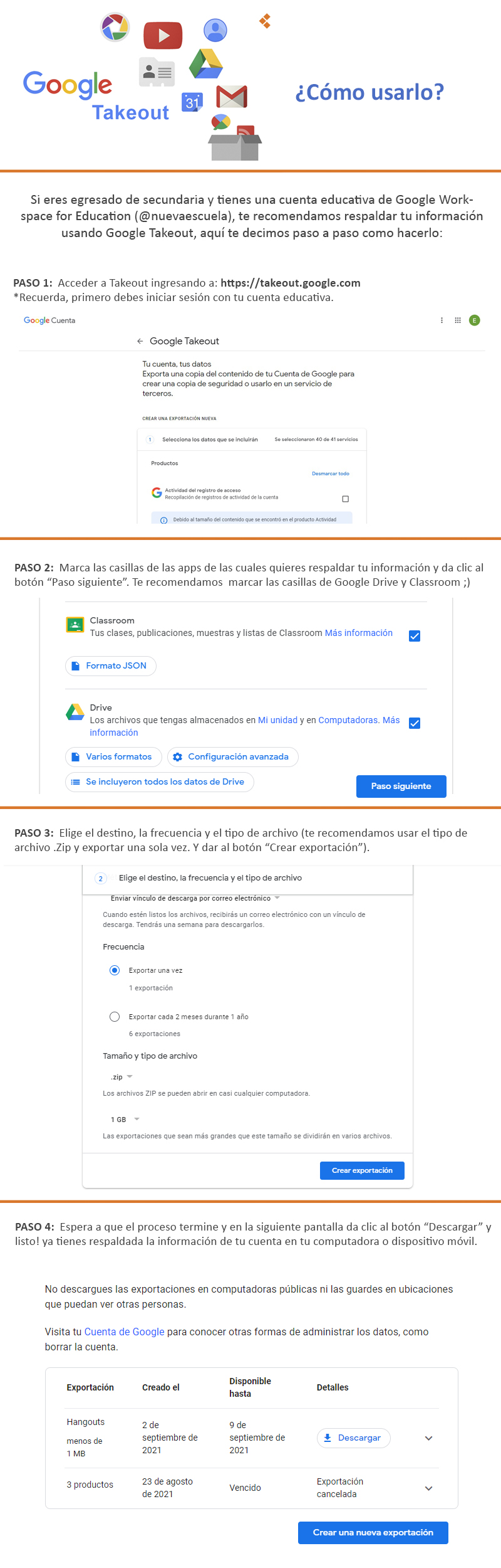 Es por esto que será necesario que respaldes la información de tu cuenta educativa para que no se pierda (por ejemplo, información de tu Google Drive entre otras), esto se hace a través de la aplicación “Google Takeout”.